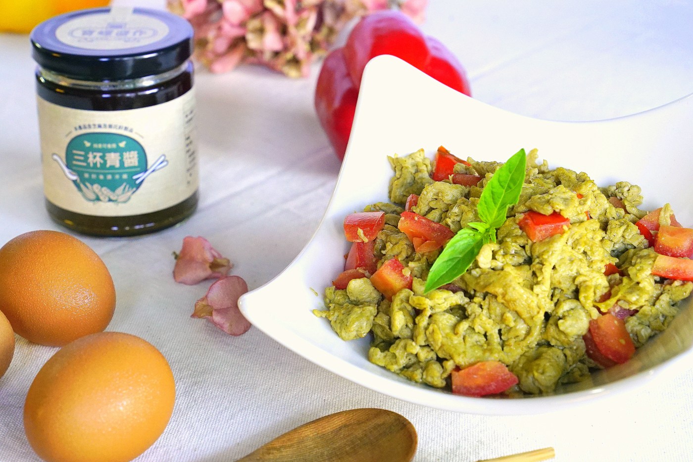 食材:4顆雞蛋、三杯青醬2T 兩大匙(=醬包一包約30ml)、牛番茄1顆