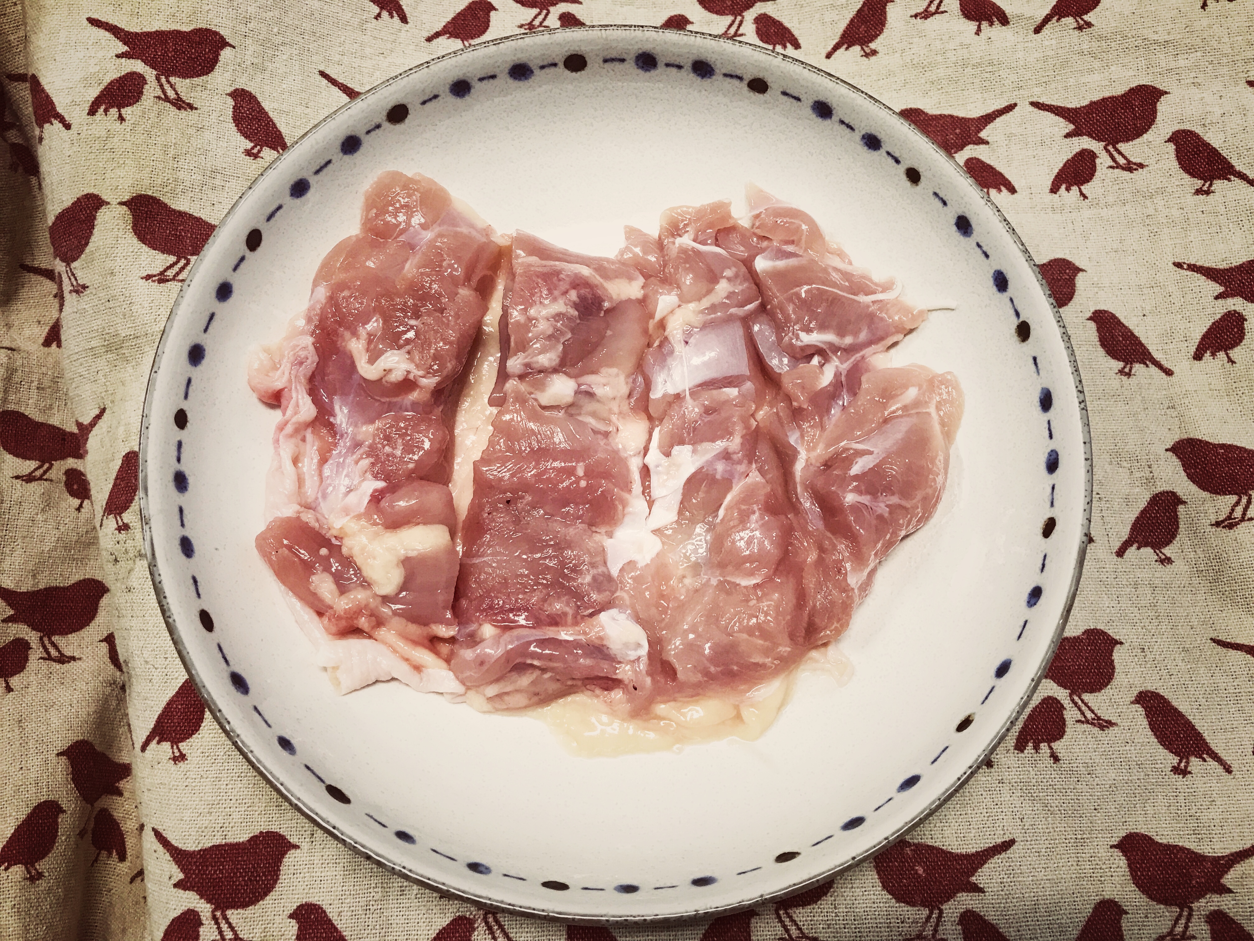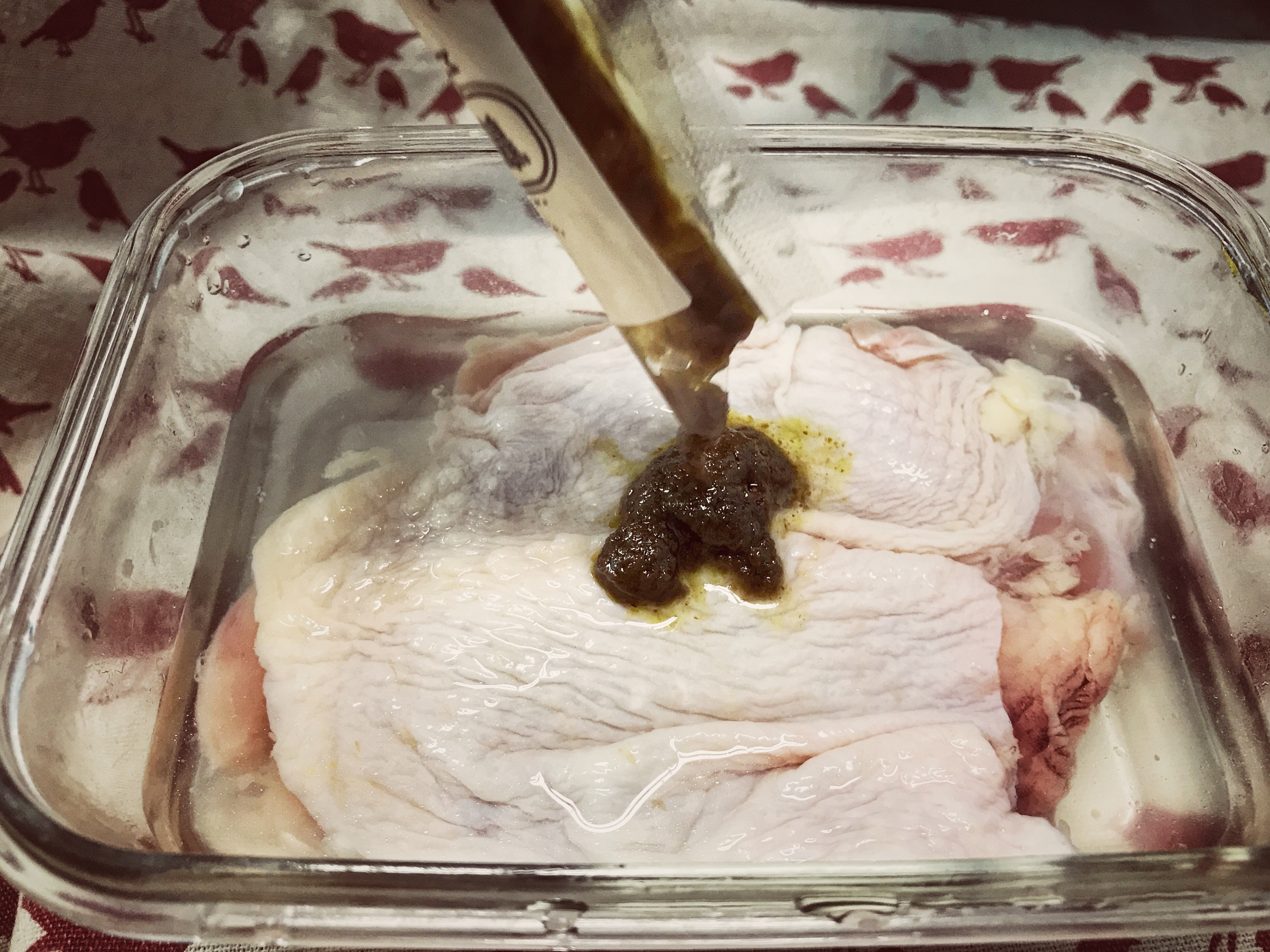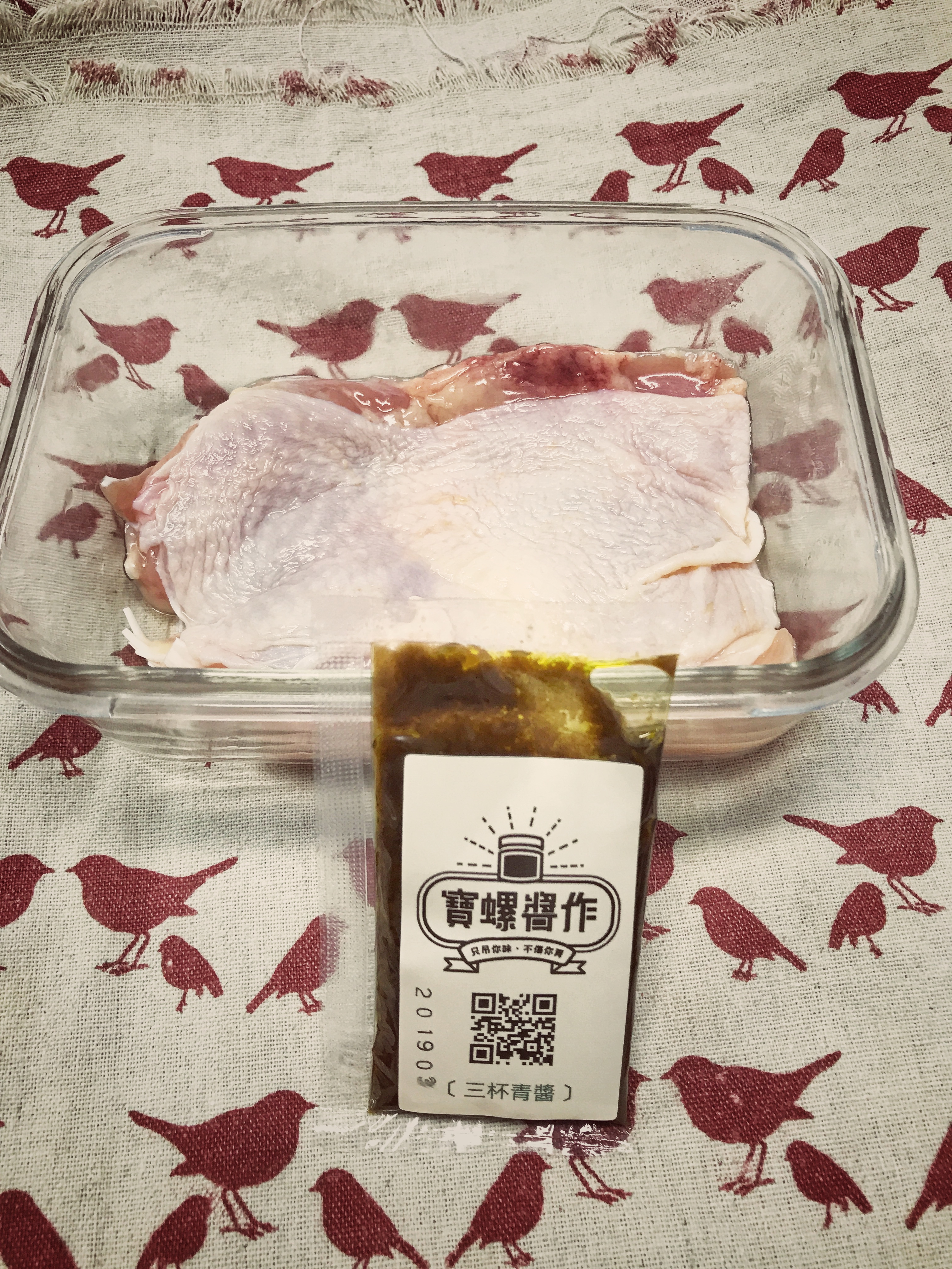 取一個較深的碗盤或密封保鮮盒,放入雞腿排後,加入和肉一樣高度的白開水,加入三杯青醬稍微抓勻,靜置15分鐘或置入冰箱隔夜使用。