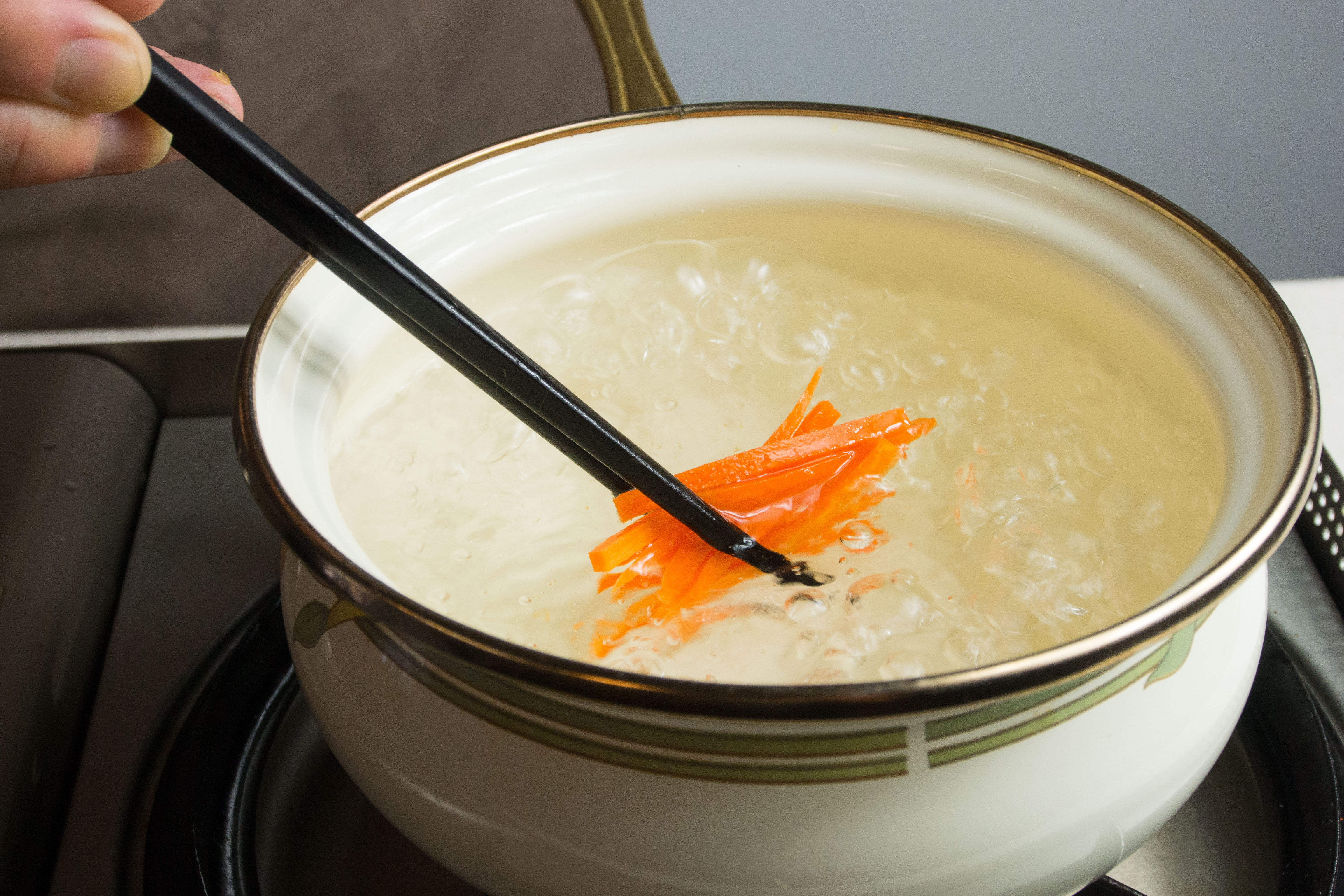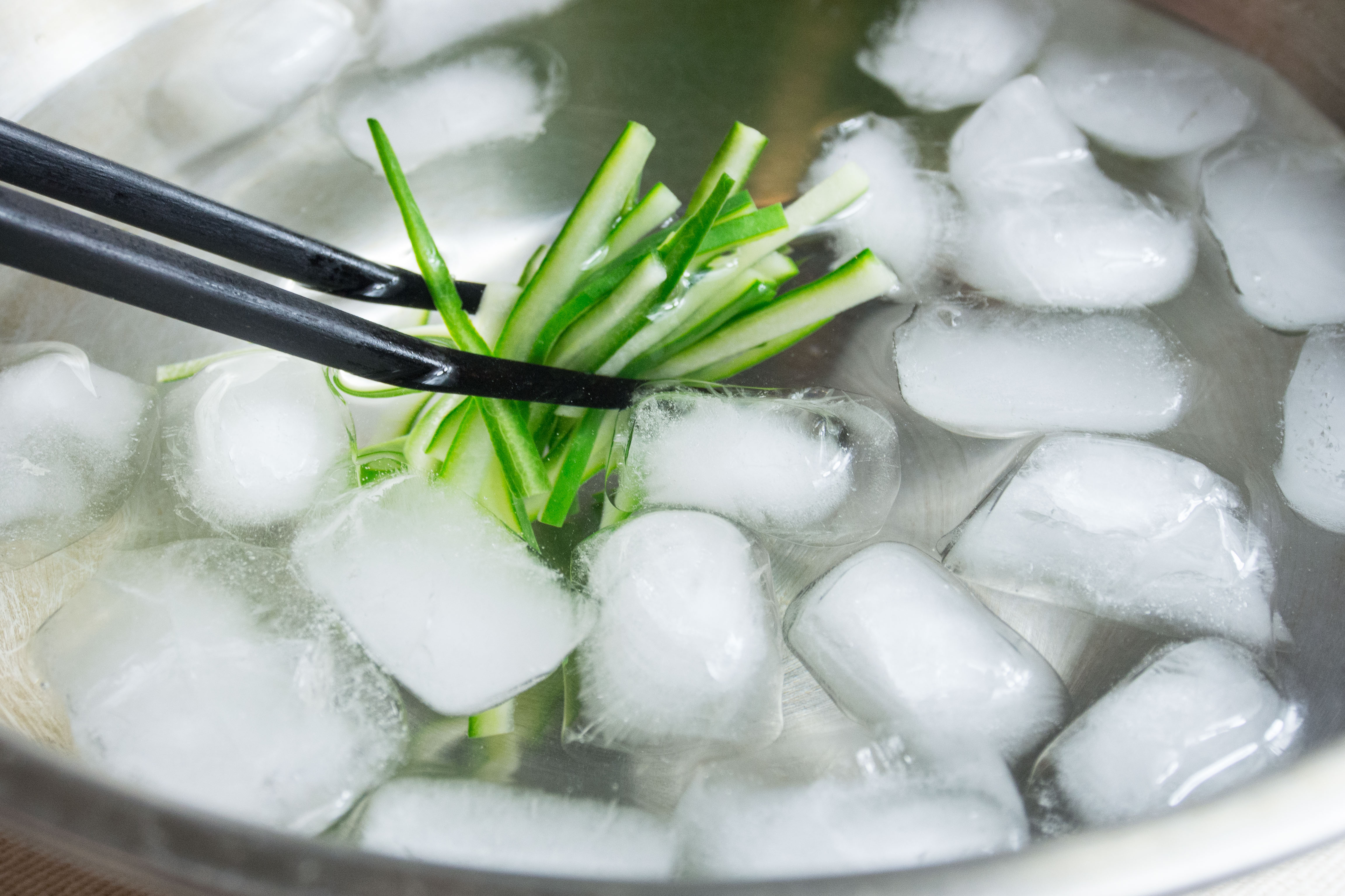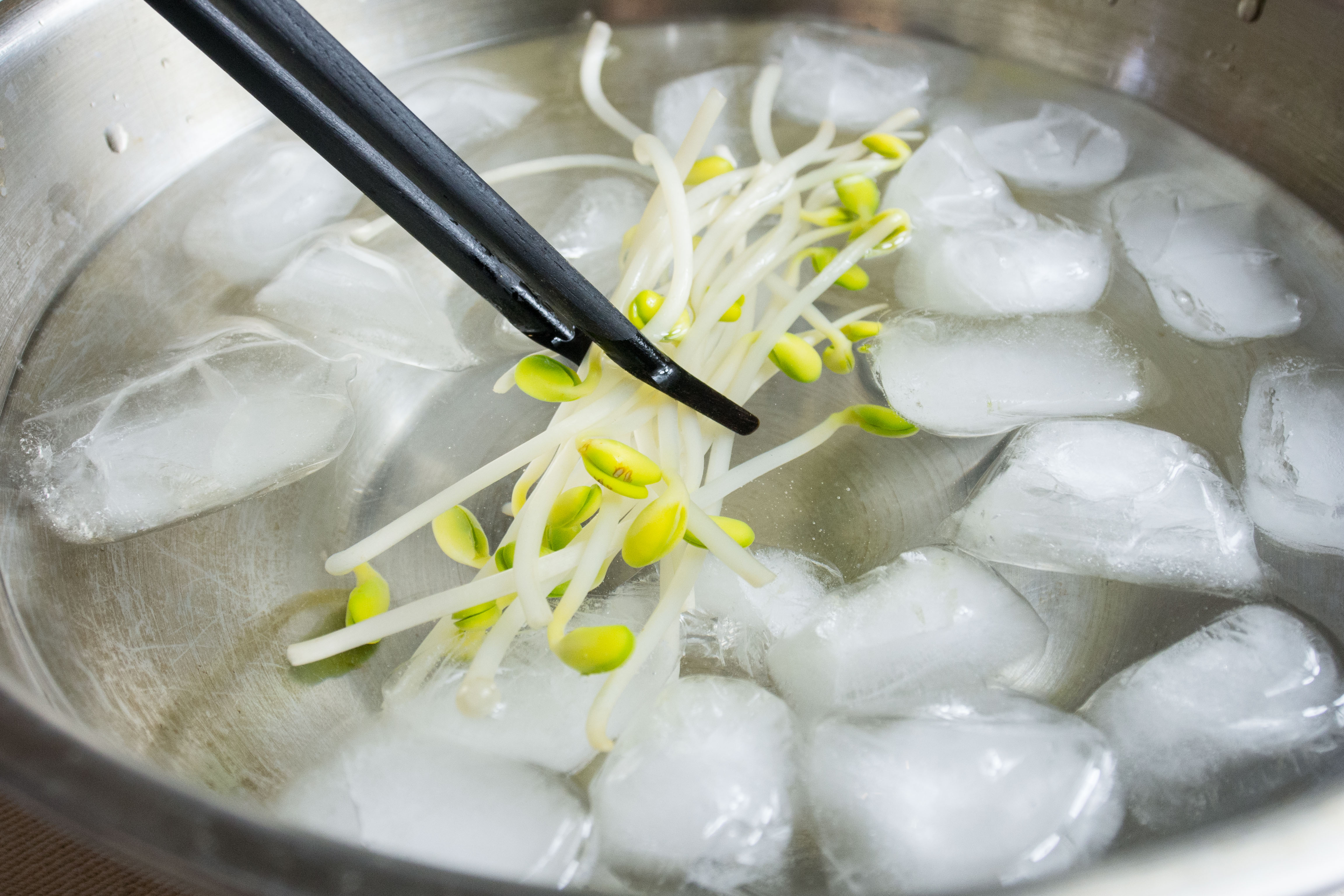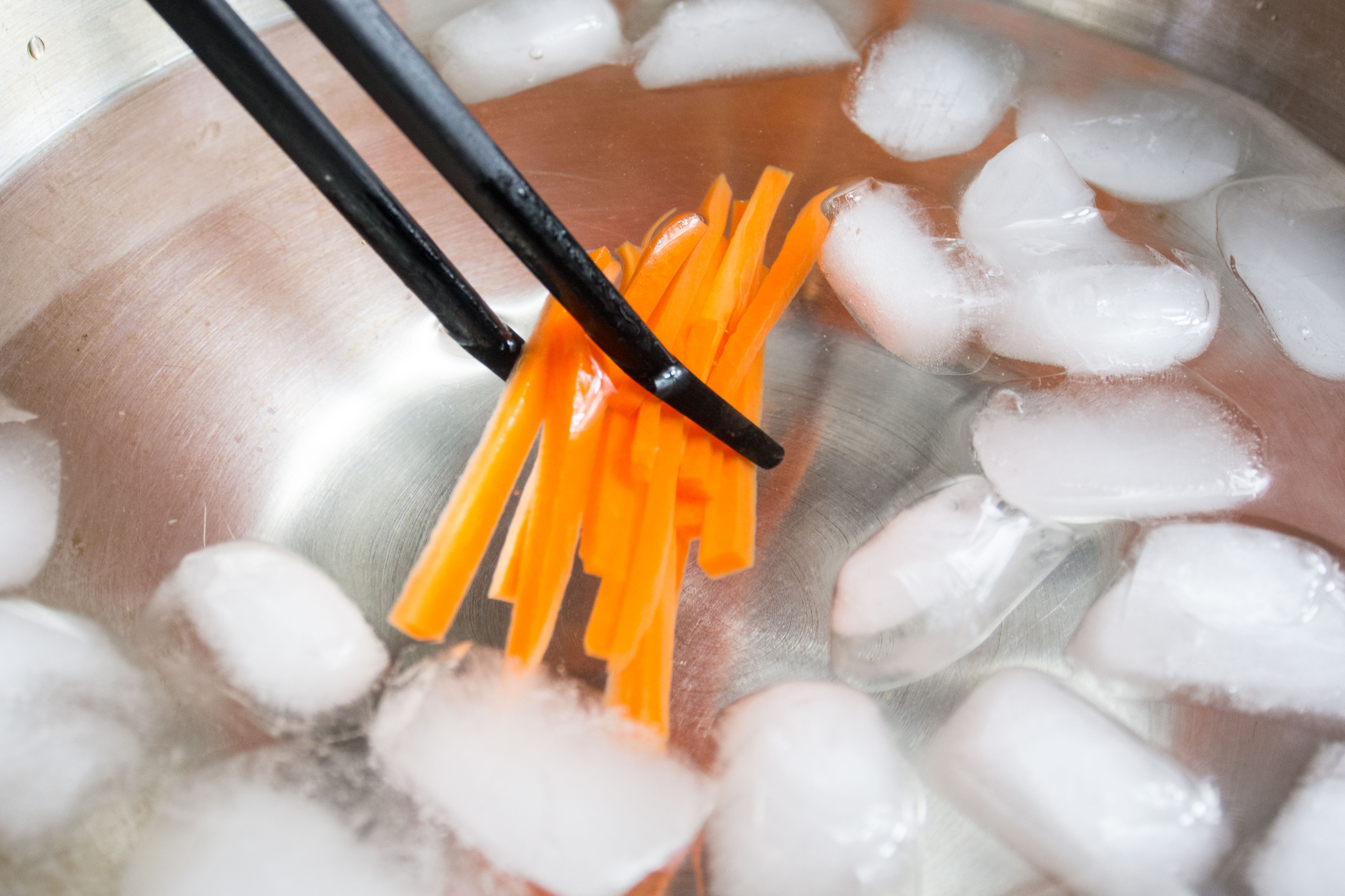 2.起一鍋熱水,水滾,加入1小匙海鹽,依序川燙黃豆芽5秒、黑木耳5秒、紅蘿蔔5秒、小黃瓜5秒