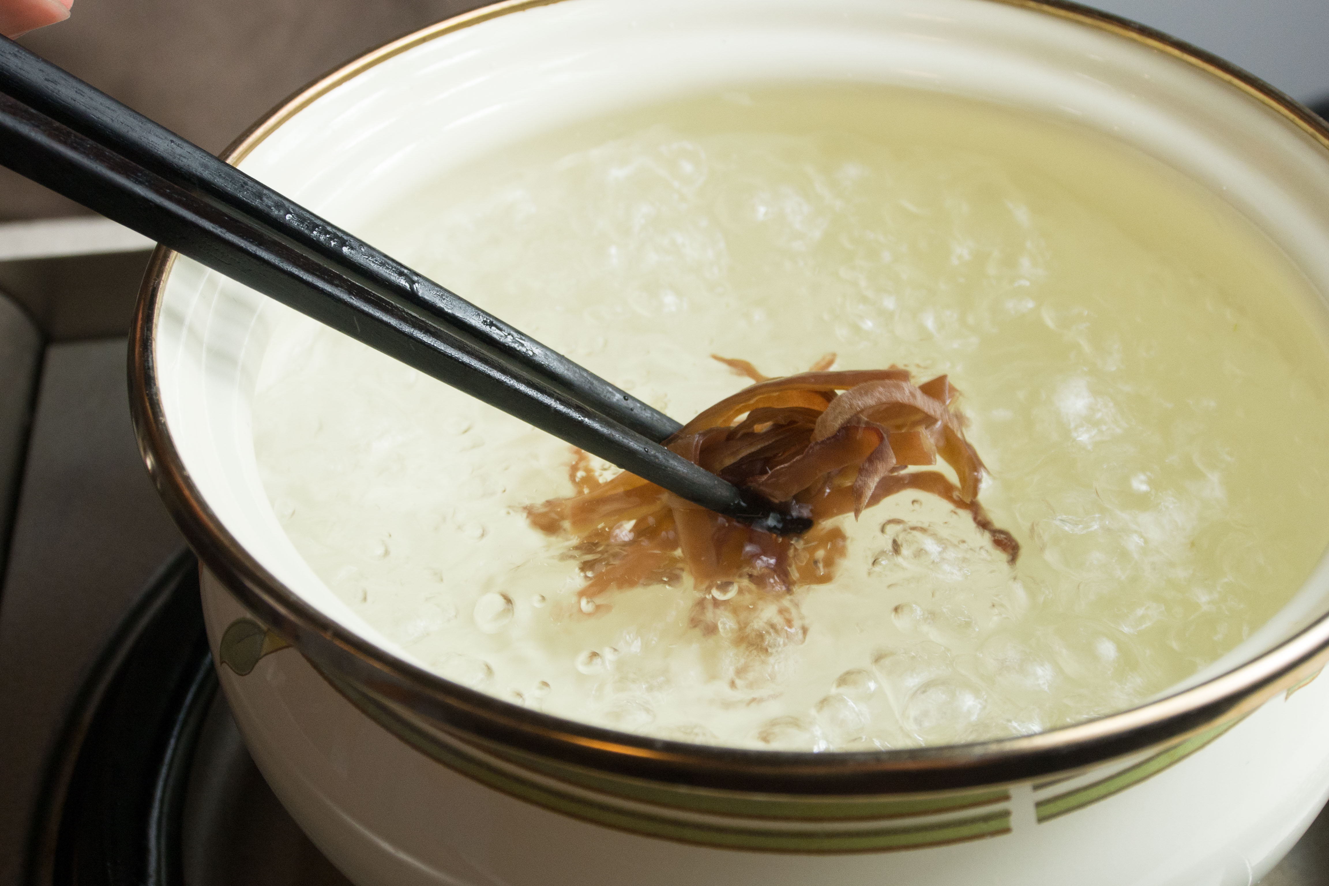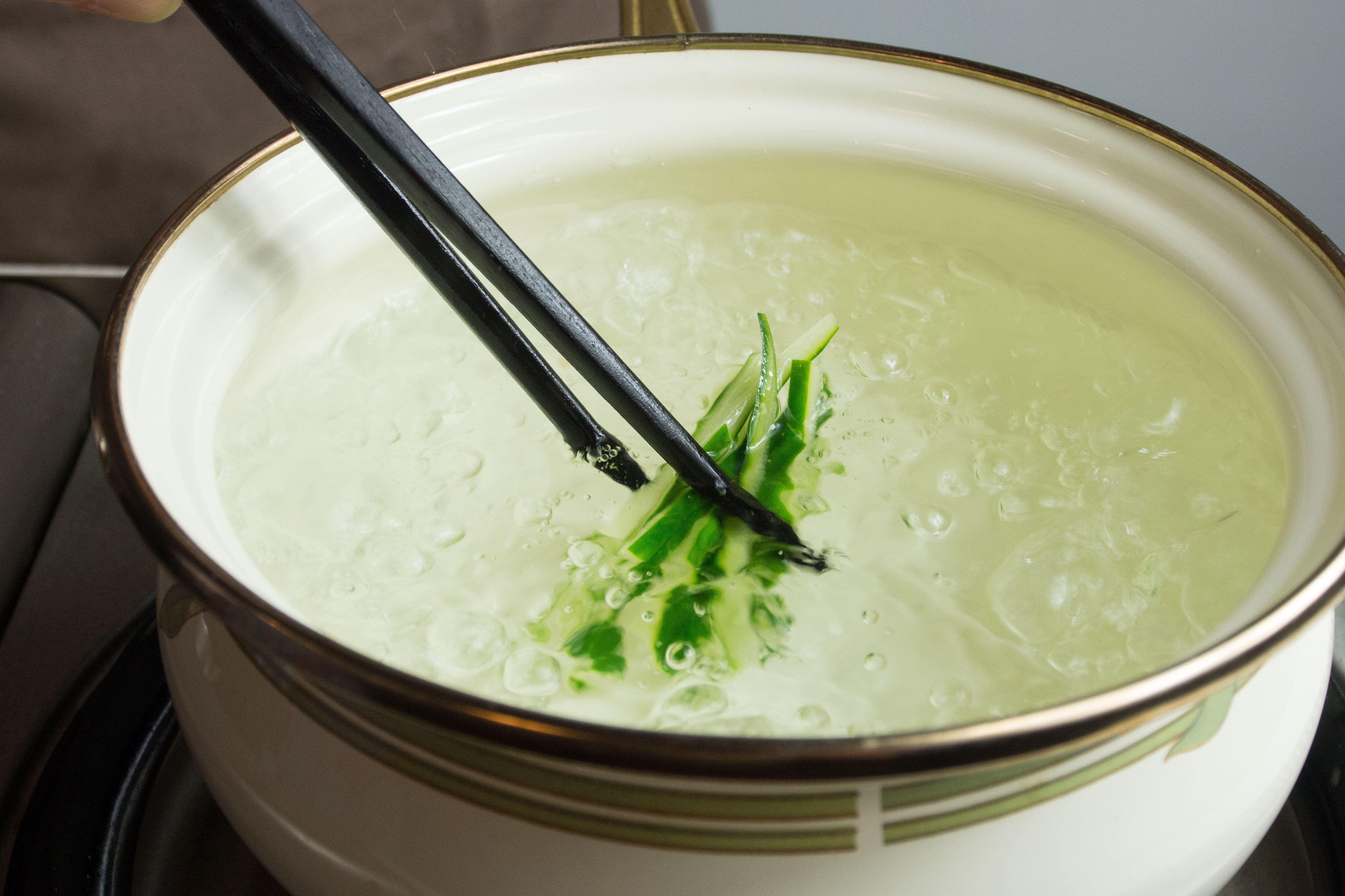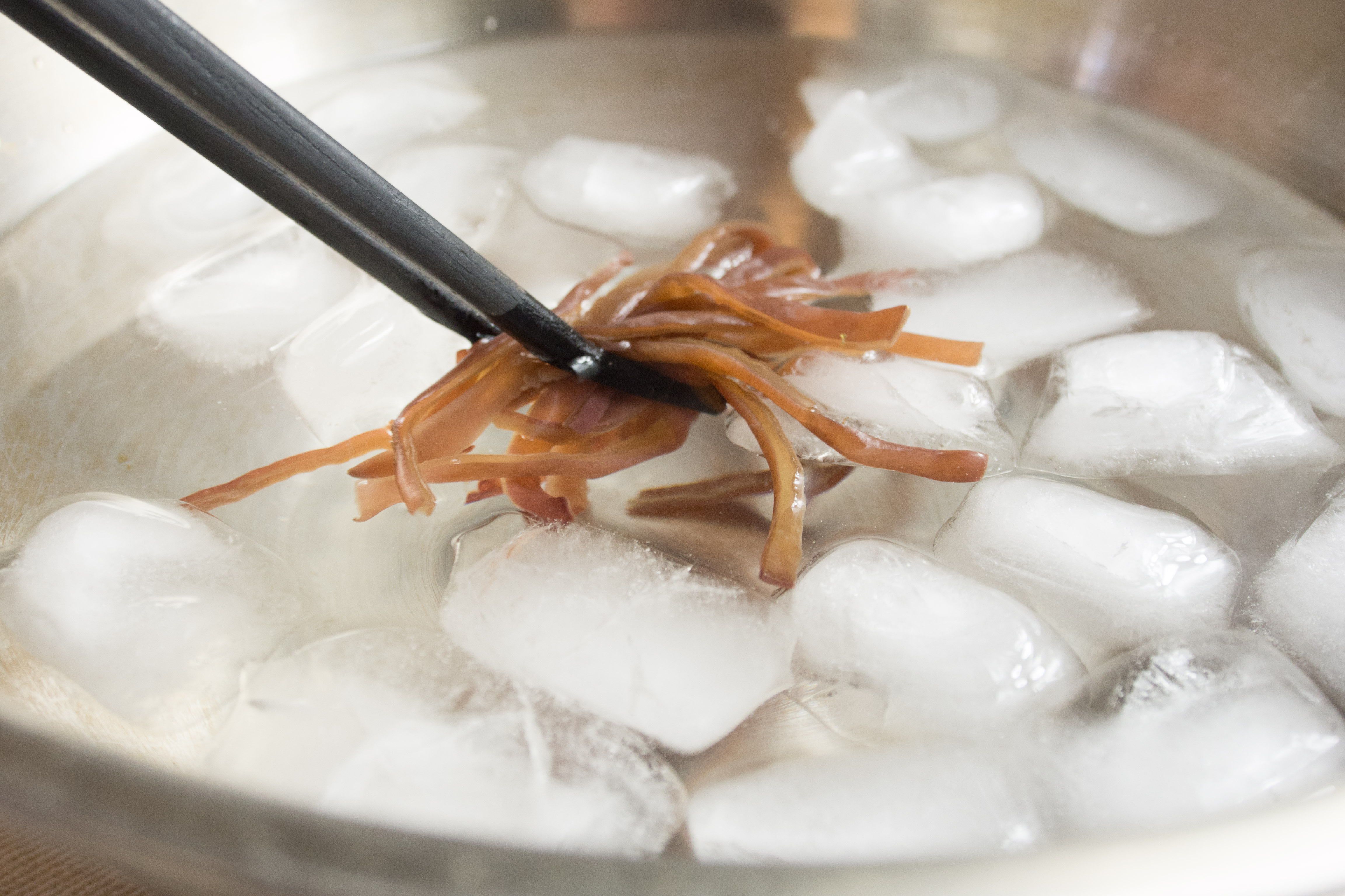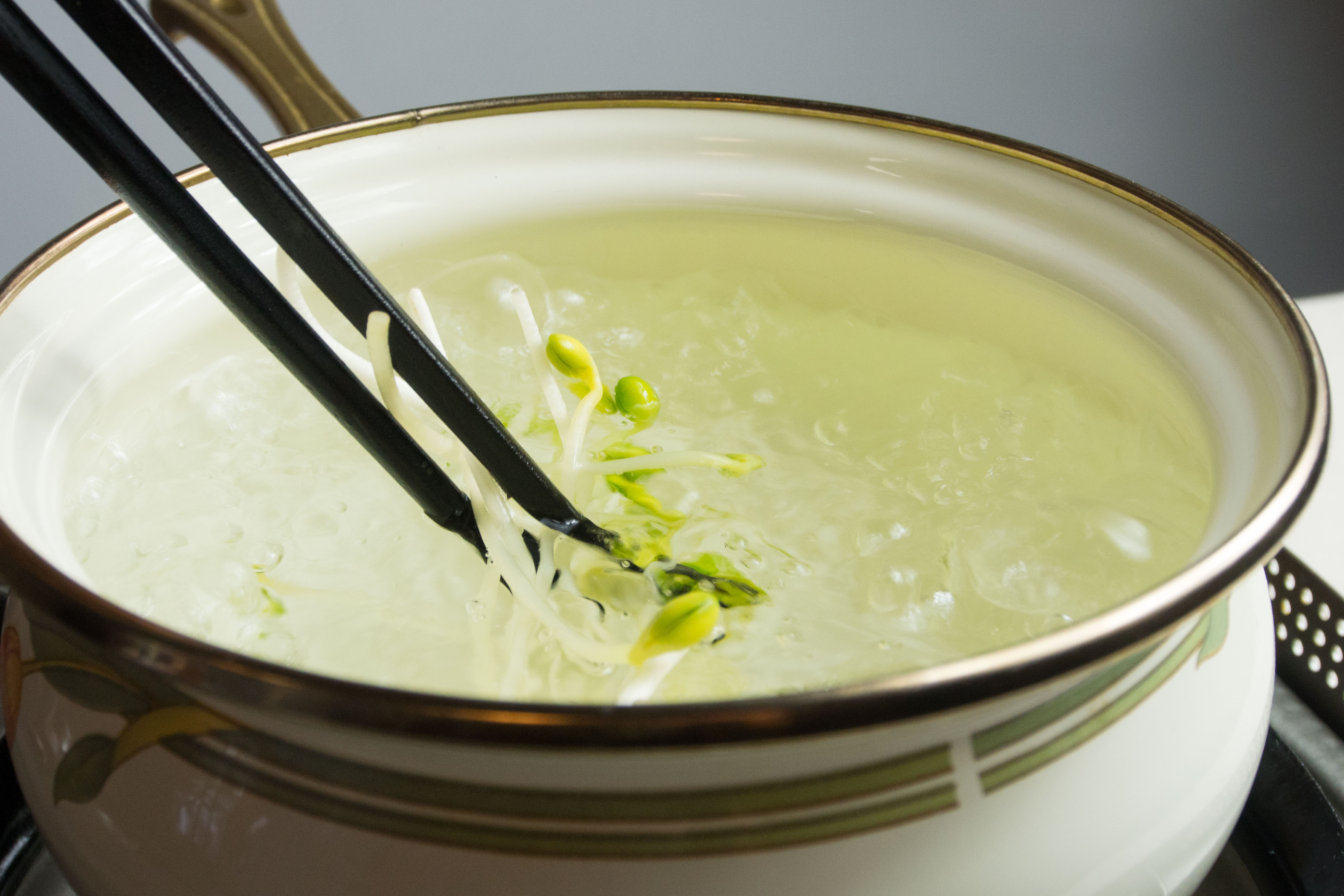 2.起一鍋熱水,水滾,加入1小匙海鹽,依序川燙黃豆芽5秒、黑木耳5秒、紅蘿蔔5秒、小黃瓜5秒