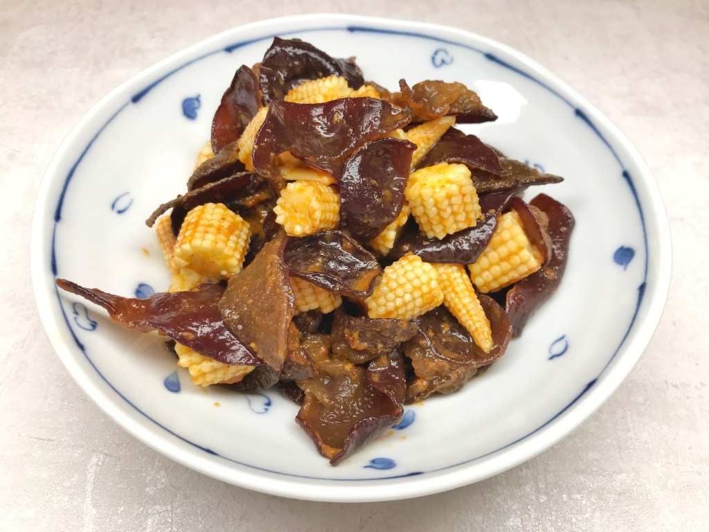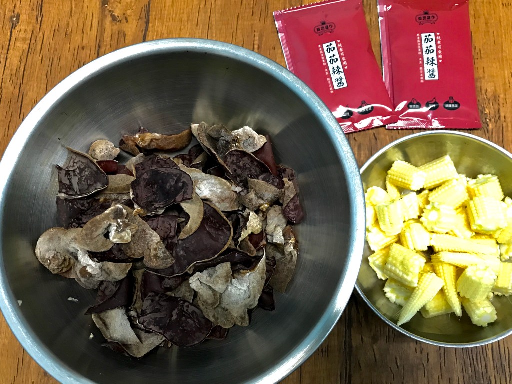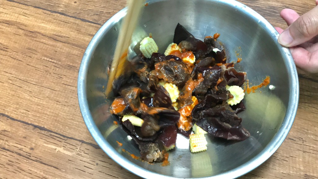 食材:新鮮木耳約50g、玉米筍數根、茄茄辣醬30g (醬包1包)