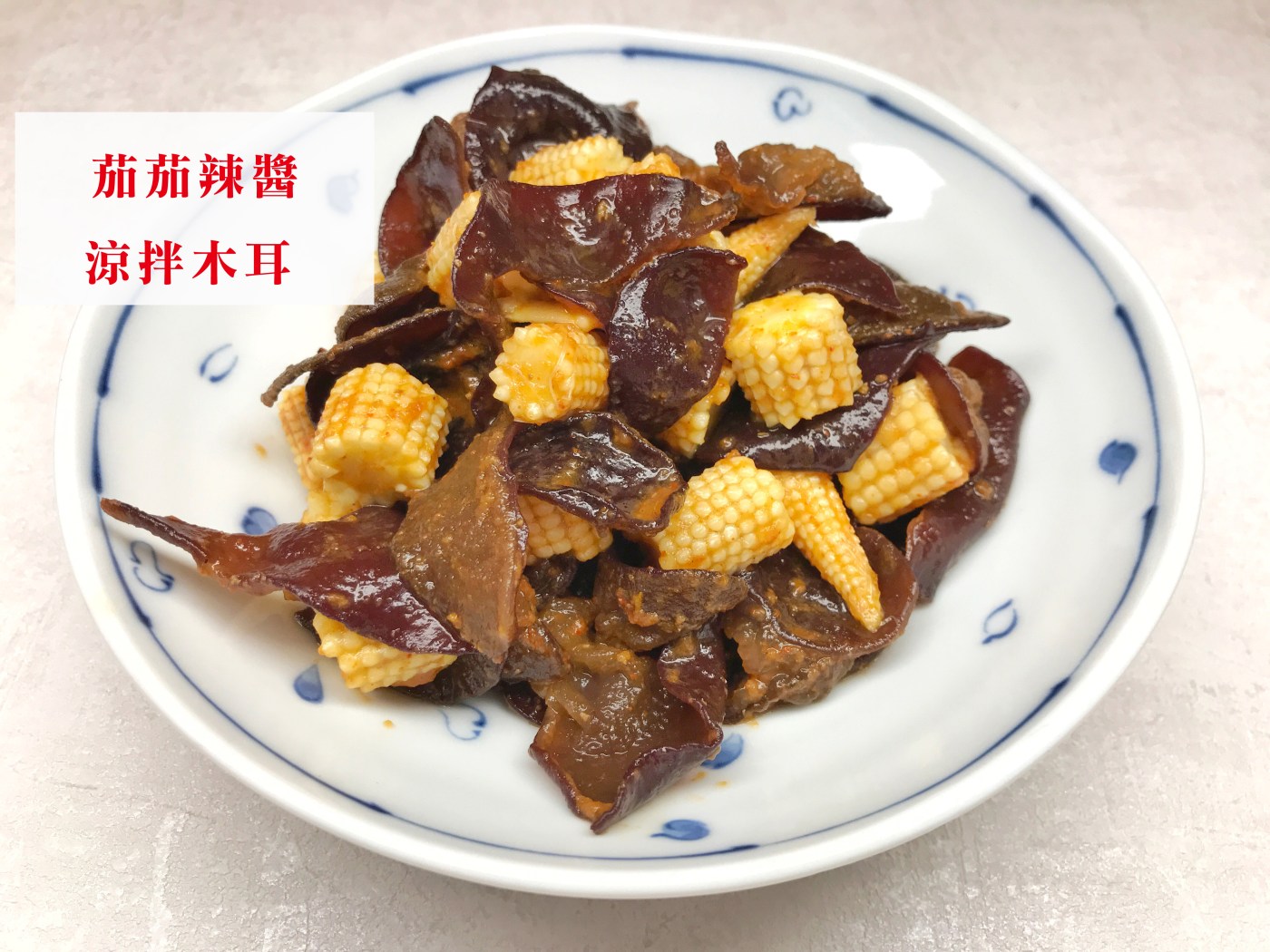 食材:新鮮木耳約50g、玉米筍數根、茄茄辣醬30g (醬包1包)