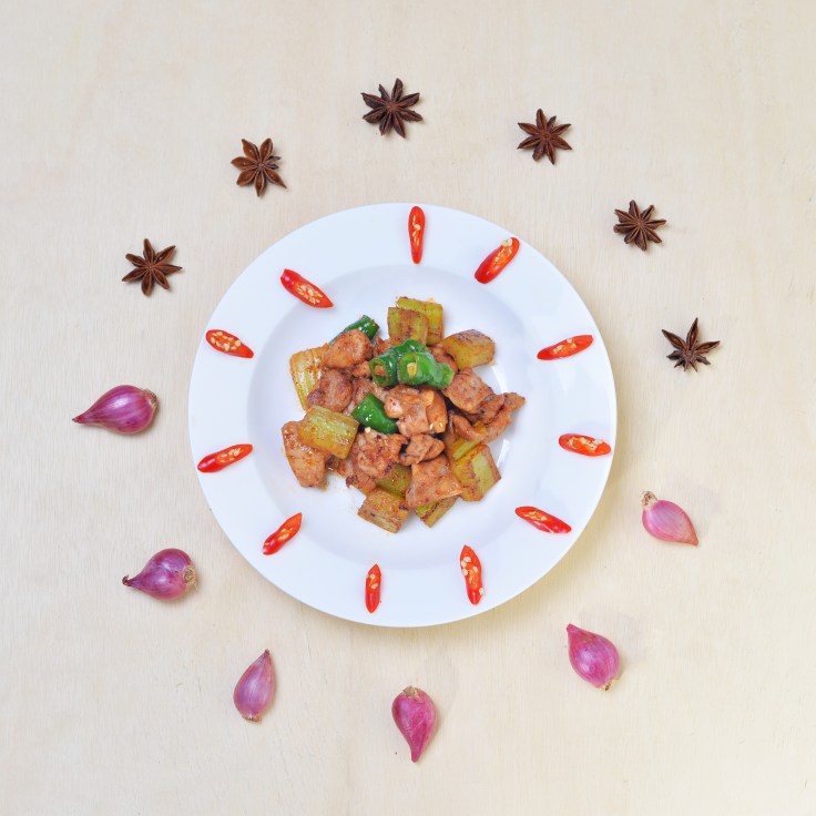 3.乾鍋入炒雞胸醃肉,炒至八分熟時,再加入青龍椒、紅辣椒,以及紅油1大匙、醬油1大匙,拌炒至全熟,即可上菜。