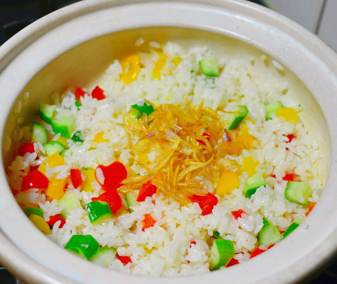 4.飯煮熟後,最後以撒入海鹽,淋上油蔥酥進行調味,即可上菜。