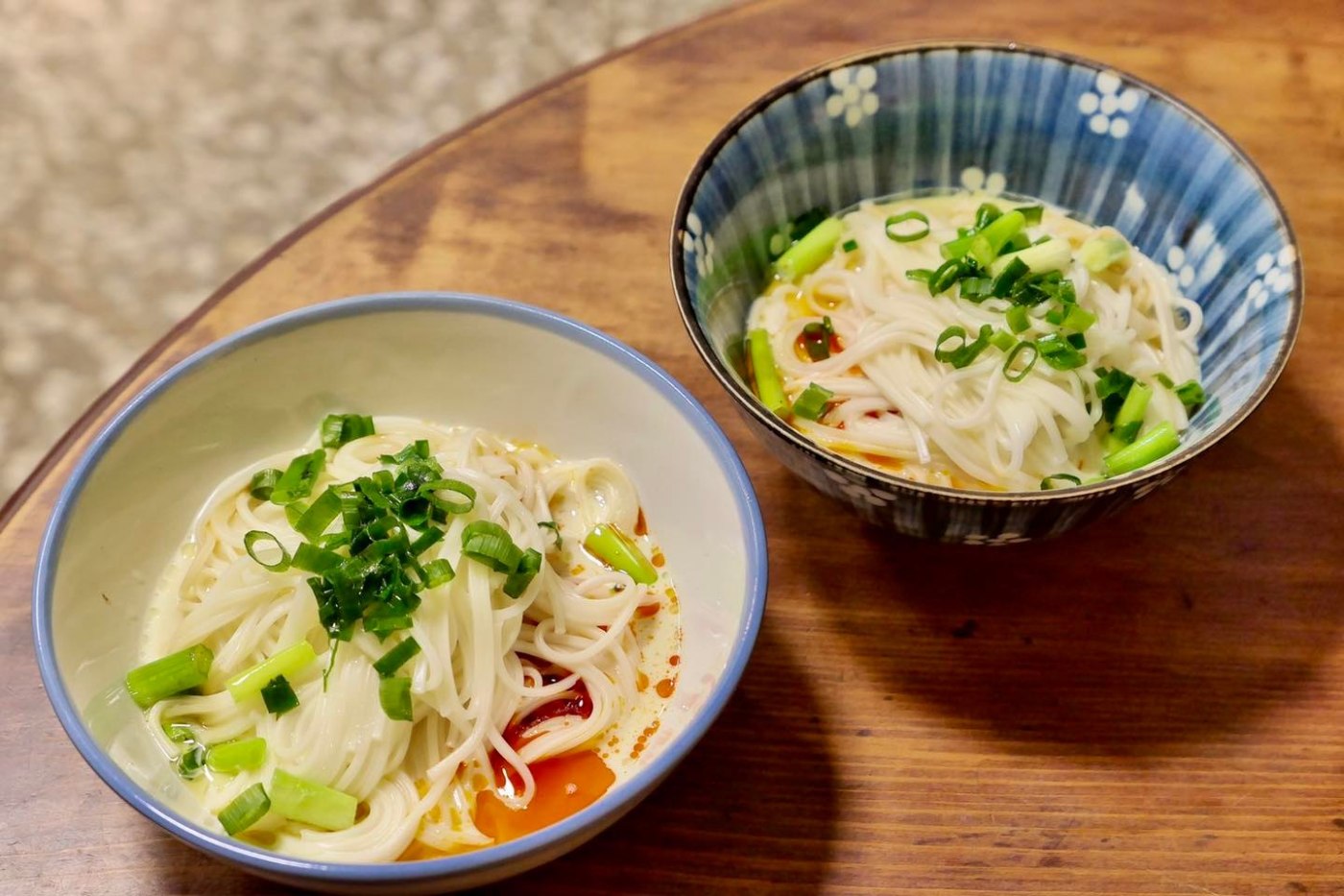 3.放入汆燙備用的白麵條,撒上蔥花或蒜末。湯底量以勿蓋過麵條為基準,這樣麵條攪拌後,醬汁才能均勻附著入味。