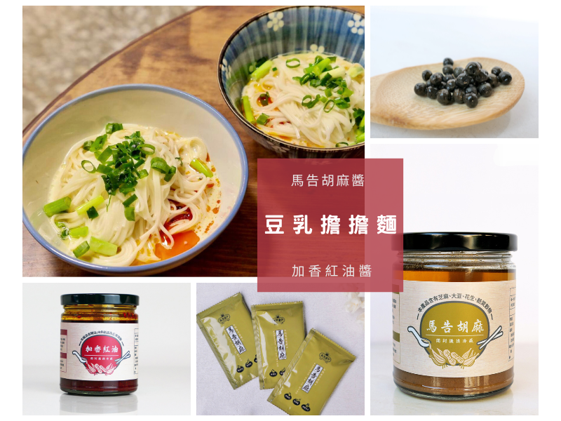2.加熱無糖豆漿(1人份約50cc),依序放入1.5包「馬告胡麻醬包」(約45g)、1包「加香紅油醬包」(30g)
