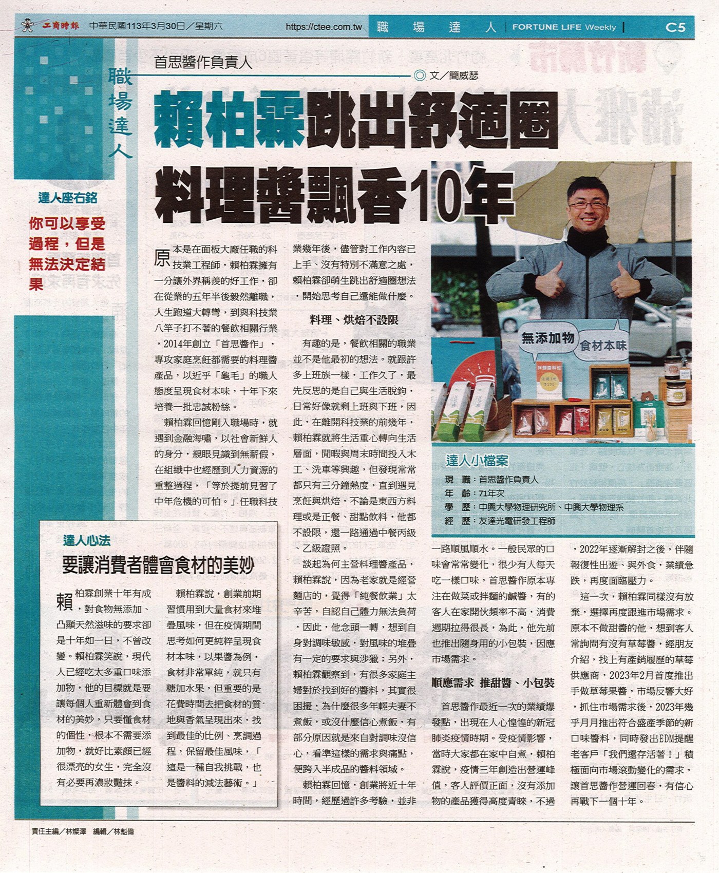 原本是在面板大廠任職的科技業工程師,賴柏霖擁有一分讓外界稱羨的好工作,卻在從業的五年半後毅然離職,人生跑道大轉彎,到與科技業八竿子打不著的餐飲相關行業,2014年創立「首思醬作」,專攻家庭烹飪都需要的料理醬產品,以近乎「龜毛」的職人態度呈現食材本味,十年下來培養一批忠誠粉絲。